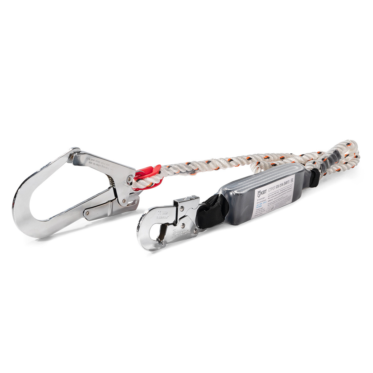 Строп с одним большим и одним малым карабинами и амортизатором предназначен для обеспечения безопасности при работе на высоте, используется как часть комплекта снаряжения индивидуальной защиты. Используется вместе с удерживающей системой. Материал стропа: полиэстеровый канат